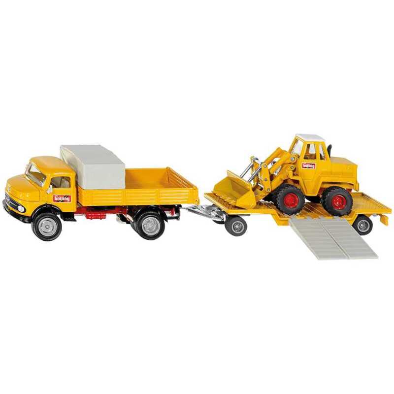 Onvergetelijke helden van de bouwplaats – Van de Mercedes-Benz wagens met de ronde motorkap zijn er bijna een miljoen gebouwd. Een buitengewoon hoog aantal en een buitengewoon lange productietijd: van 1959 tot 1996. De vrachtwagen heeft al goederen, bouwmateriaal en grond vervoerd in de periode van het “wirtschaftswunder” en is ook vandaag de dag nog over de hele wereld in gebruik. Hij was het gezicht van de vele bouwplaatsen in de Bondsrepubliek. De karakteristieke kap kan worden geopend, de laadbak kan kantelen. De 100 PK sterke Dieselmotor trekt een dieplader met de legendarische Kramer Allrad 411. De gele wielladers verplaatsen sinds de jaren 50 grond en los stortgoed maar ook buizen en pallets. Het span komt voorrijden in het historische design van bouwbedrijf Bölling.