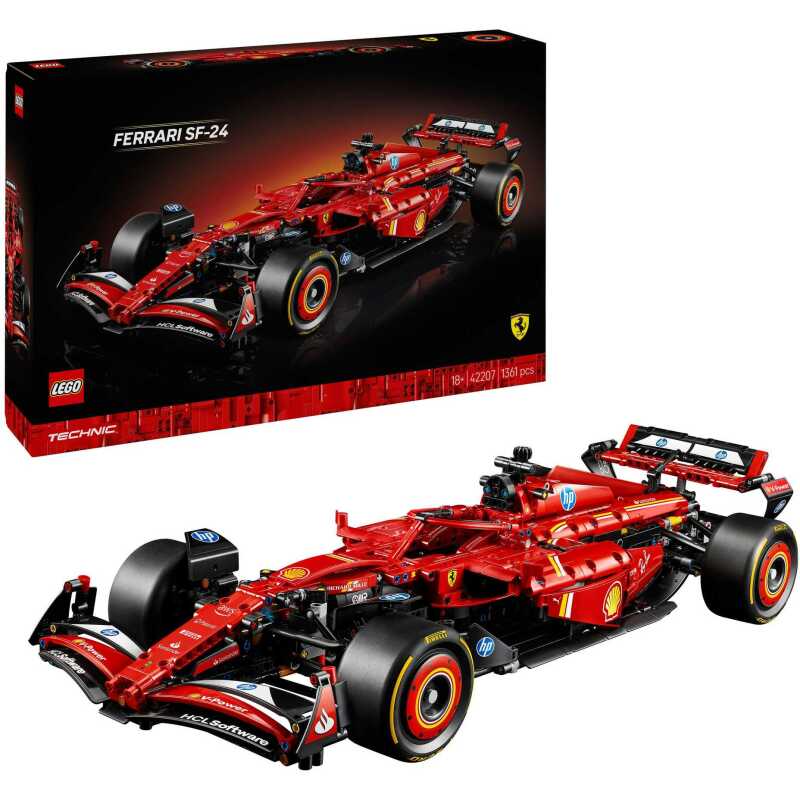 De sensatie van het racecircuit komt thuis met deze spannende set uit de LEGO Technic serie: het model van een Ferrari SF-24 F1 raceauto! De LEGO Technic Ferrari SF-24 F1 auto (42207) bestaat uit in totaal 1361 onderdelen en is een spannend bouwproject voor ervaren LEGO-bouwers. Autosportfans zullen enthousiast zijn over de vele details: de stuurinrichting, de versnellingsbak met 2 versnellingen, de bedrukte banden. Er is ook het getrouw ontworpen DRS-venster en de V6-motor met roterende MGU-H-unit. Een eerbetoon aan de Formule 1-racerij dat ook een mooi figuur slaat als presentatiemodel. De auto in deze set is 13 cm hoog, 61 cm lang en 24 cm breed.
