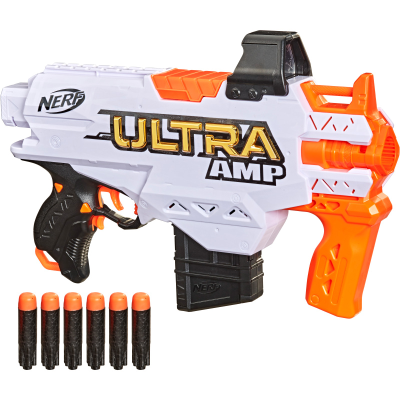 De NERF Ultra Amp Blaster maakt indruk met zijn gemotoriseerde dartlanceerder, waarmee je in een mum van tijd dartpijlen kunt afschieten. Het wordt geleverd met een verwijderbaar 6-dart clip magazijn dat 6 darts achter elkaar kan afvuren. Door de versnellingsknop ingedrukt te houden, wordt de motor bekrachtigd. Als dan de trekker wordt overgehaald, vliegt er een pijltje naar zijn doel. De NERF Ultra Amp Blaster wordt ook geleverd met een geïntegreerd vizier om het schot te richten. NERF Ultra Blasters brengen het spel naar een hoger niveau door een geëvolueerd ontwerp en verbeterde prestaties voor meer bereik, nauwkeurigheid en snelheid. NERF Ultra Darts zijn de verst vliegende darts en zijn voorzien van een innovatieve dartpunt, vliegende vin technologie en Ultra materiaal. Ultra blasters werken alleen met Ultra darts. De darts vliegen tot 36 meter ver.