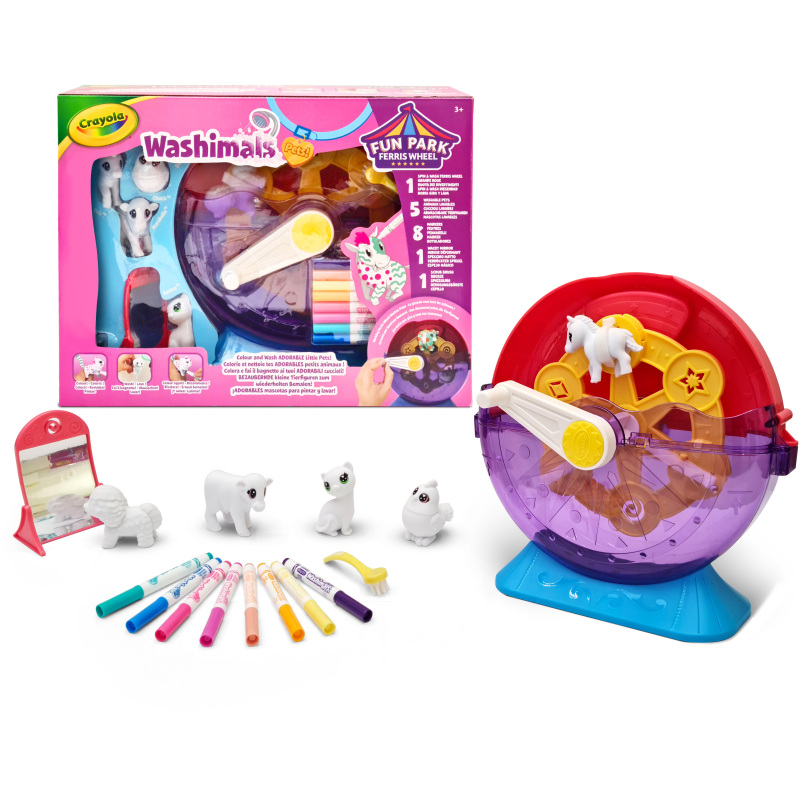 De Crayola Washimals Reuzenrad set neemt jou en jouw nieuwe favoriete dieren mee naar het allercoolste pretpark. Beleef eindeloos kleurplezier door de Washimals in te kleuren, schoon te wassen en opnieuw in te kleuren. Deze creatieve set bevat maar liefst 5 nieuwe Washimals dieren: een koe, kip, kat, hond en vrolijke ezel. Deze schattige dieren zijn klaar om te spelen in de attracties! Kleur de dieren in met de bijgeleverde afwasbare viltstiften in 8 felle kleuren. Gebruik jouw fantasie en creativiteit om prachtige kleurontwerpen te maken. Klaar met inkleuren en versieren? Bekijk jouw kleurrijke creaties in de lachspiegel! Het wassen van de dieren is minstens zo leuk als het inkleuren. Plaats één tot drie Washimals in het reuzenrad en draaien maar! Bij elke ronde komen de dieren door het water waardoor ze langzaam weer wit worden! Gebruik het schoonmaakborsteltje om de laatste inktresten weg te schrobben. Laat de diertjes even drogen en ze zijn weer klaar voor nieuwe kleurdesigns! Voor welke kleuren en patronen ga jij deze keer? De inkt van de kleurstiften is niet alleen afwasbaar van de dieren, ook is de inkt afwasbaar van de meeste oppervlakken, huid en uitwasbaar uit de meeste kledingstukken.