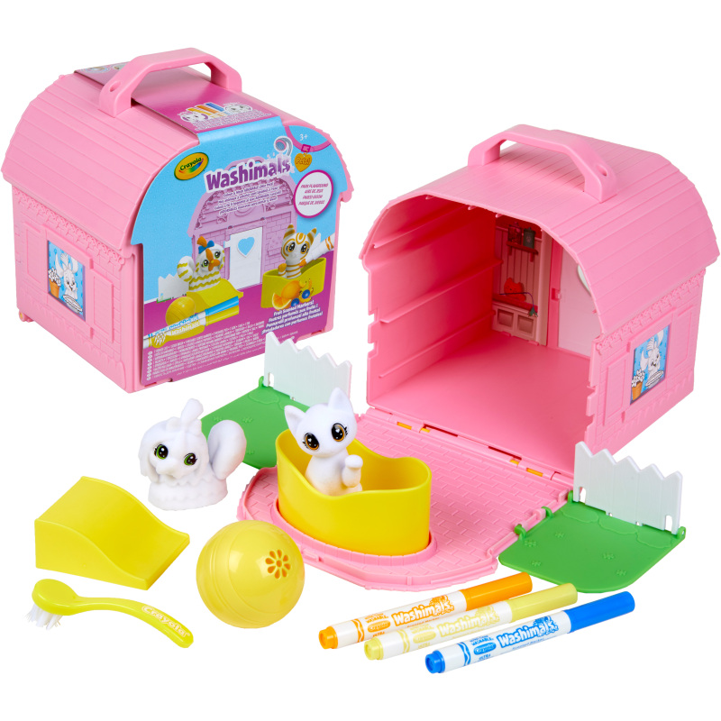 Buitenspelen met de Crayola Washimals Speeltuin Set! Klap de Washimals set uit tot schattig huisje met echte speeltuin. Geef jouw nieuwe huisdieren kleur én geur! De bijgeleverde viltstiften in deze set zijn namelijk wel heel speciaal… ze hebben alle drie een andere fruitige geur. Wees creatief en kleur de dieren in zoals jij dat wilt. De hond en kat zijn nu klaar om lekker in de speeltuin te spelen en van de glijbaan te glijden of een balspel te spelen met de gele bal. Vergeet niet ook het huis te versieren door de witte afbeeldingen in te kleuren! Klaar met spelen en toe aan nieuwe kleurdesigns? Was de dieren schoon in het badje. Je hebt alleen water en het schoonmaakborsteltje nodig. Tijd om opnieuw te kleuren! Na het spelen en kleuren is de set weer helemaal terug in te klappen en biedt tegelijkertijd ruimte om de Washimals dieren en viltstiften in op te bergen. Neem de set gemakkelijk overal mee naartoe aan het handvat. Een perfect cadeau voor creatieve kinderen. Op naar een volgend avontuur!