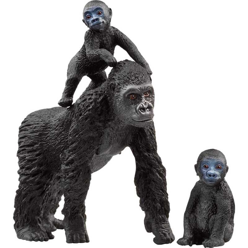 Wat een schattig gorillagezin! De gorillamoeder leunt op haar armen en houdt haar twee baby’tjes nauwlettend in de gaten, zodat ze veilig blijven. Een van de babygorilla’s is waarschijnlijk wat moe. Hij zit op de grond en staart wat slaperig voor zich uit. Misschien is het tijd voor een dutje. Zijn zusje is veel actiever: ze probeert rechtop te staan, op alle vier de poten door de jungle te kruipen en klimt zelfs op moeders rug. Er zijn zoveel verschillende spelletjes die je kunt spelen met dit levensechte gorillagezin. Misschien dat de schattige baby’s ooit grote gorilla’s worden in je speelkamer?
